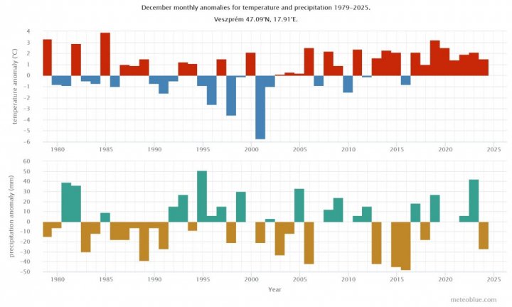 Ezt támasztja alá a veszprémi, decemberre vonatkozó hőmérsékleti és csapadékanomália-diagram is, amely az átlagtól való eltérést mutatja. 2001 és részben 2002 kiugróan hideg volt, azóta azonban többnyire az átlagosnál enyhébb decemberi hetek jellemzőek.